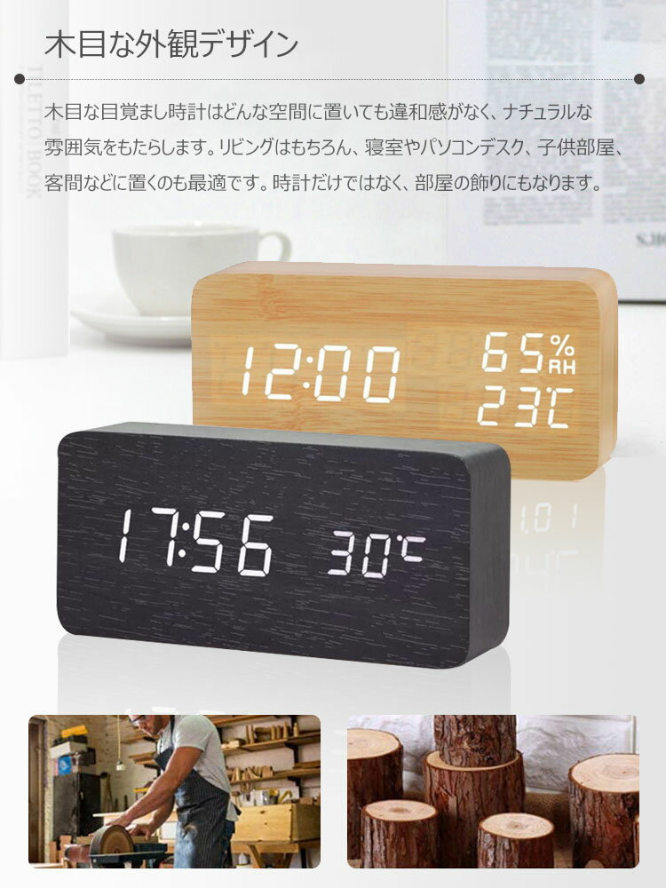 デジタル時計 目覚まし 置き時計 LEDデジタル 木目 おきどけい 温度湿度計 USB給電式 乾電池給電式カレンダー 記憶機能 ナチュラル シンプルLED数字表示