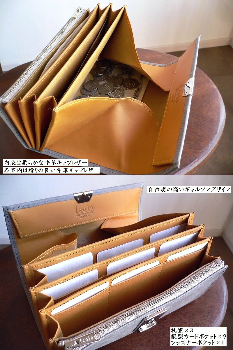 内装はアイソラの代表モデル ギャルソンウォレットの 「三段錠」と呼ばれるデザイン。