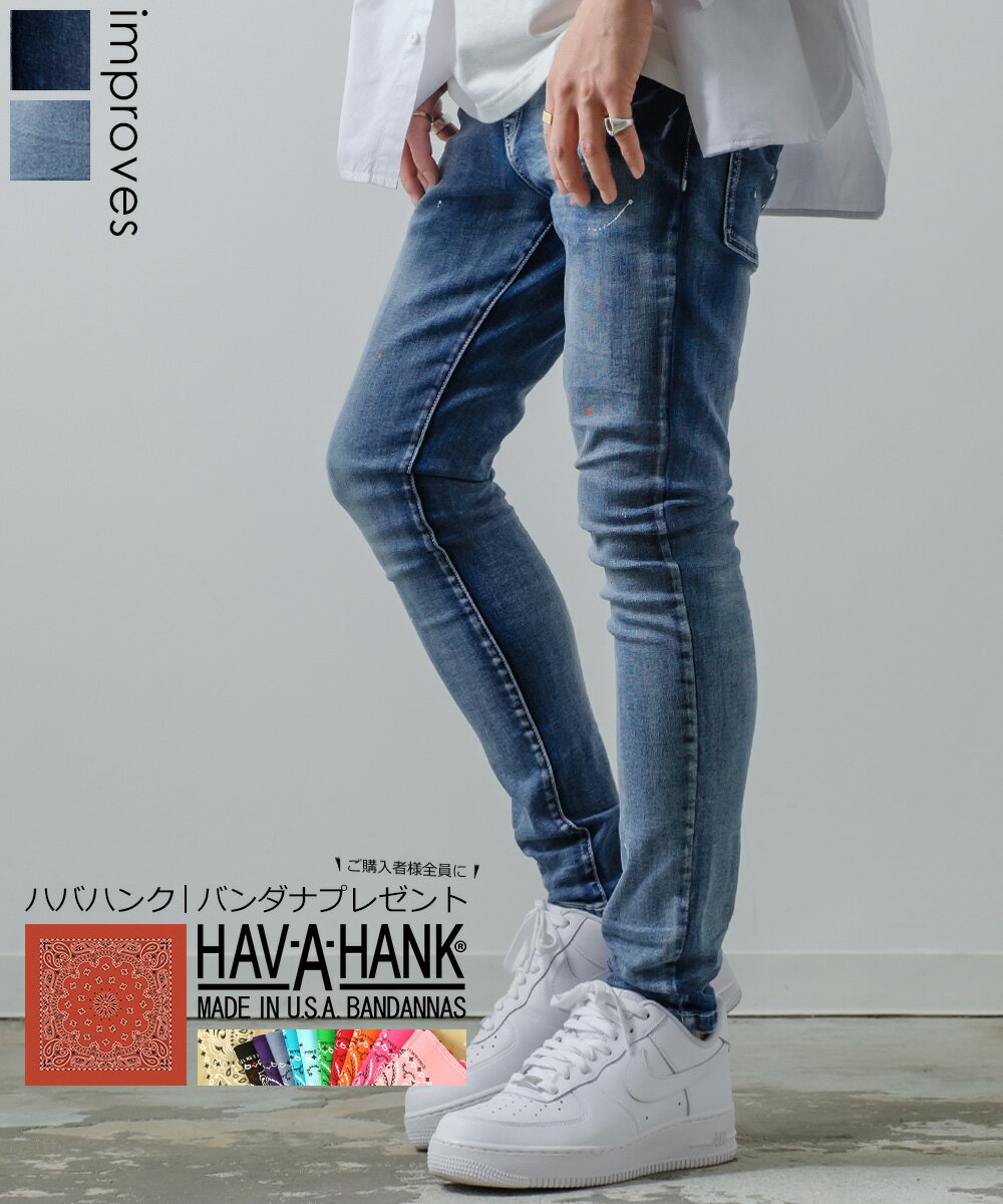 デニム メンズ レディース ダメージデニム スリム ストレッチ スキニーデニム ペンキ クラッシュ 青 黒 スキニーパンツ スキニーデニム デニムパンツ ジーンズ ジーパン HAV-A-HANK(ハバハンク) バンダナ付き ストリート系 ストリートファッション improves