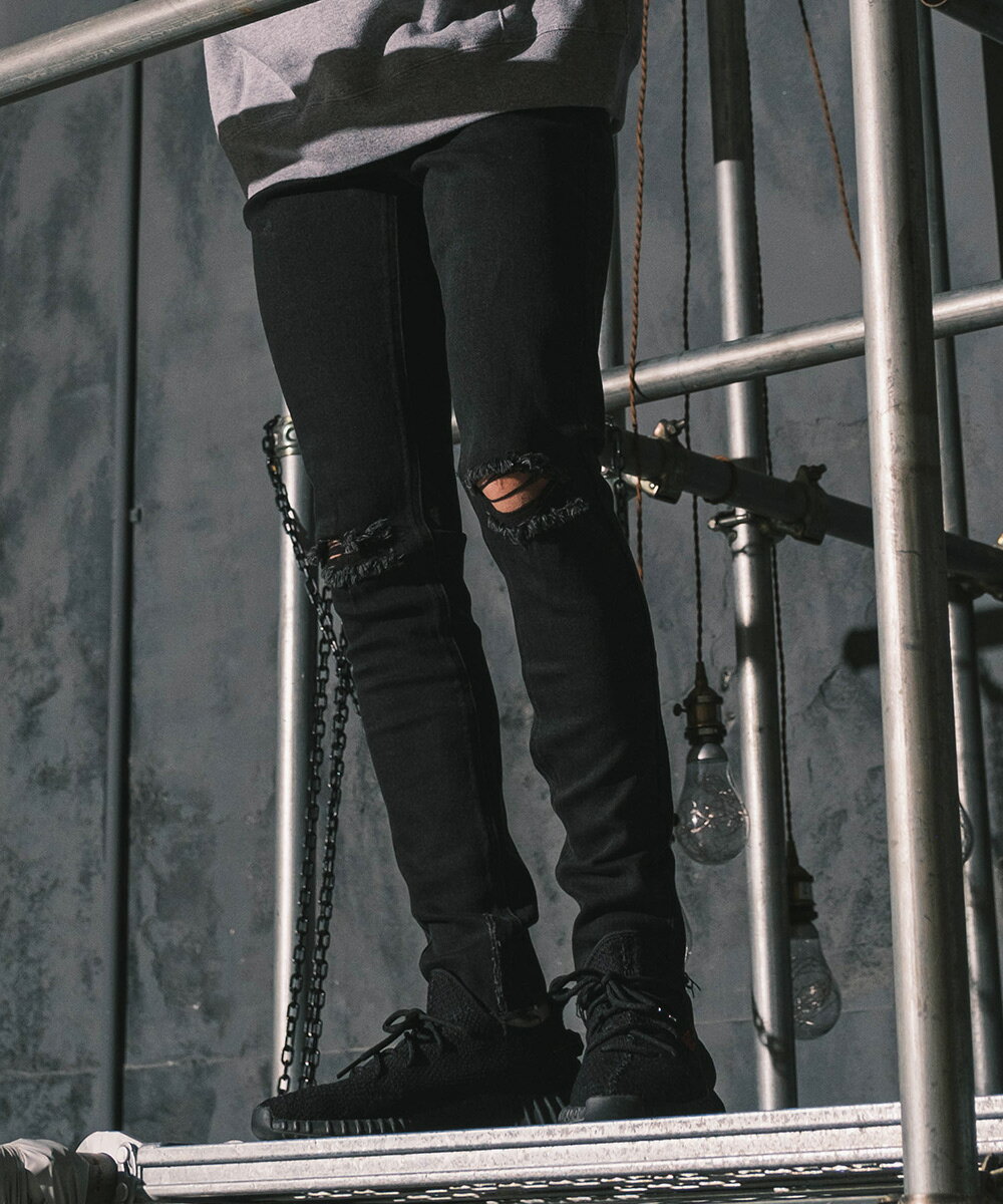 スキニーフィット ダメージ&クラッシュ リペア ブラックデニムパンツ メンズ